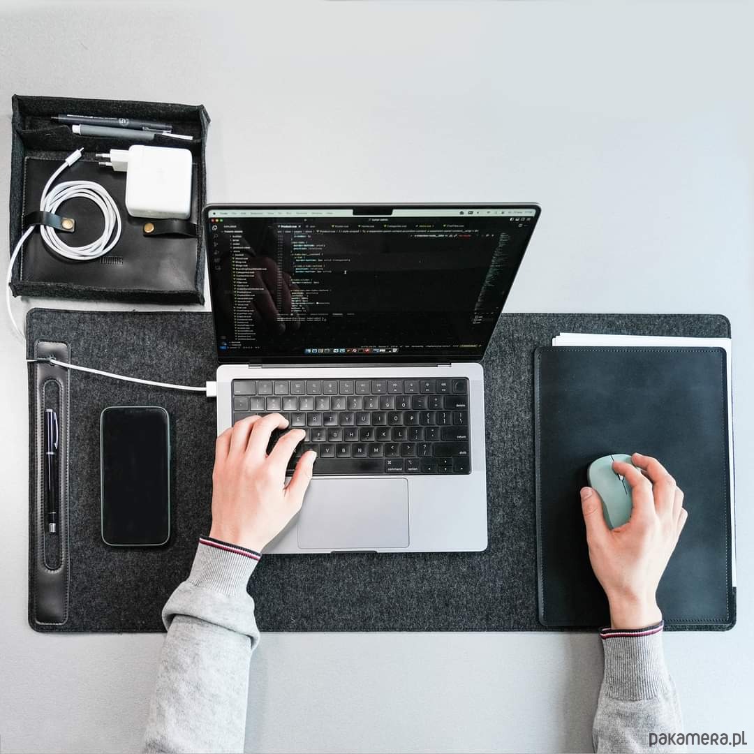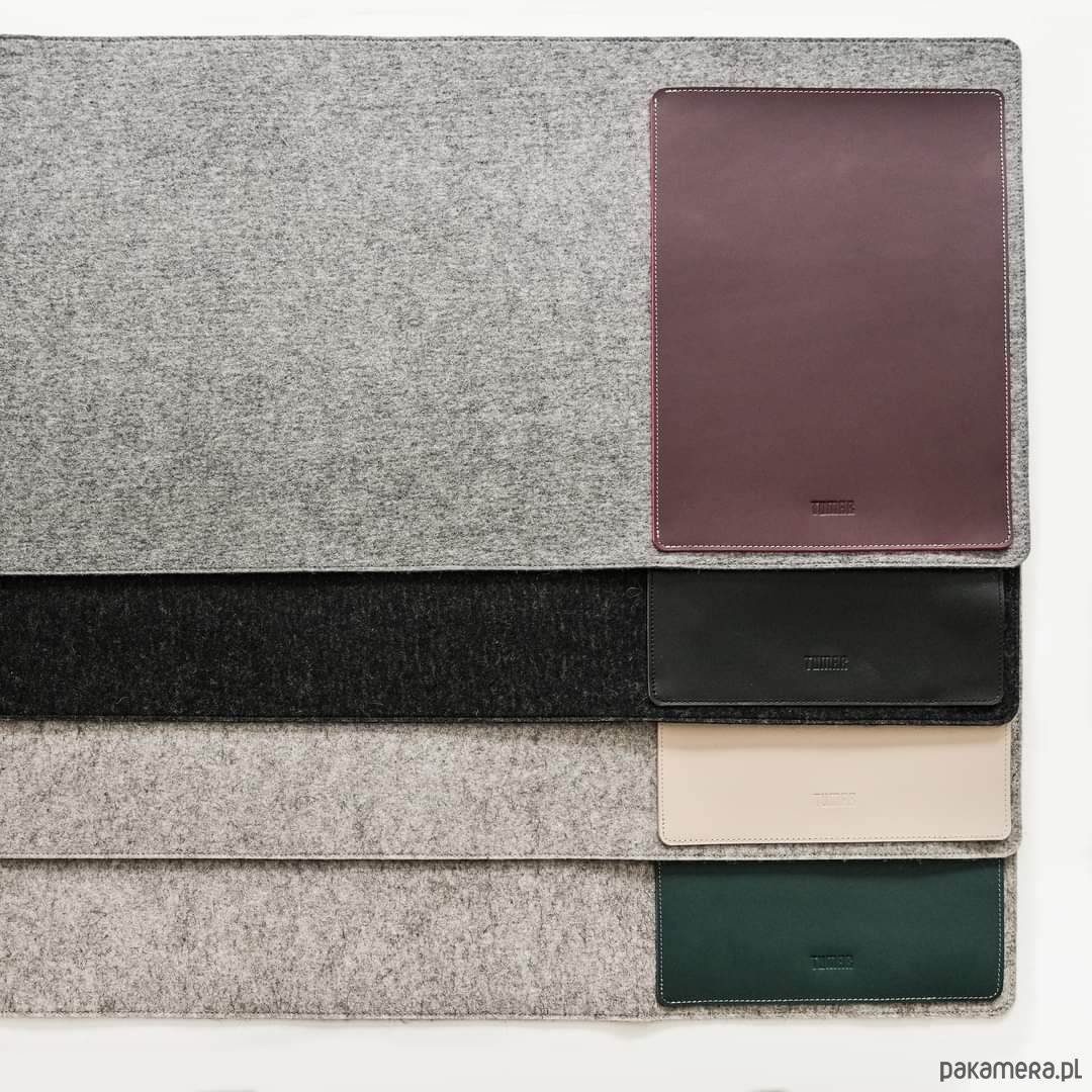 Органайзер для ноутбука с настольным ковриком. 90% шерсть, 10% полиэстер с элементами из натуральной бежевой кожи. Трёхчастная конструкция 83x38 см. Защищает ноутбук, организует рабочий стол.